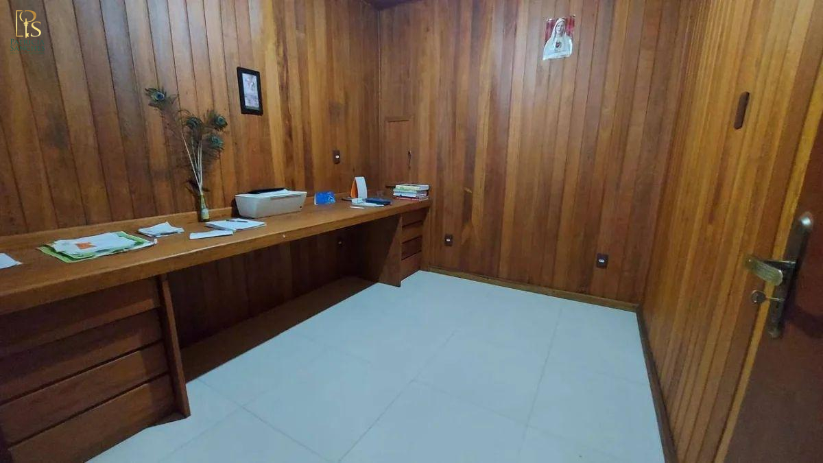 escritório com armários embutidos, cozinha com armários, lavanderia coberta e garagem para 5 carros.
