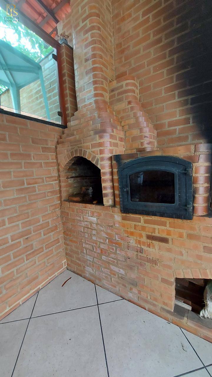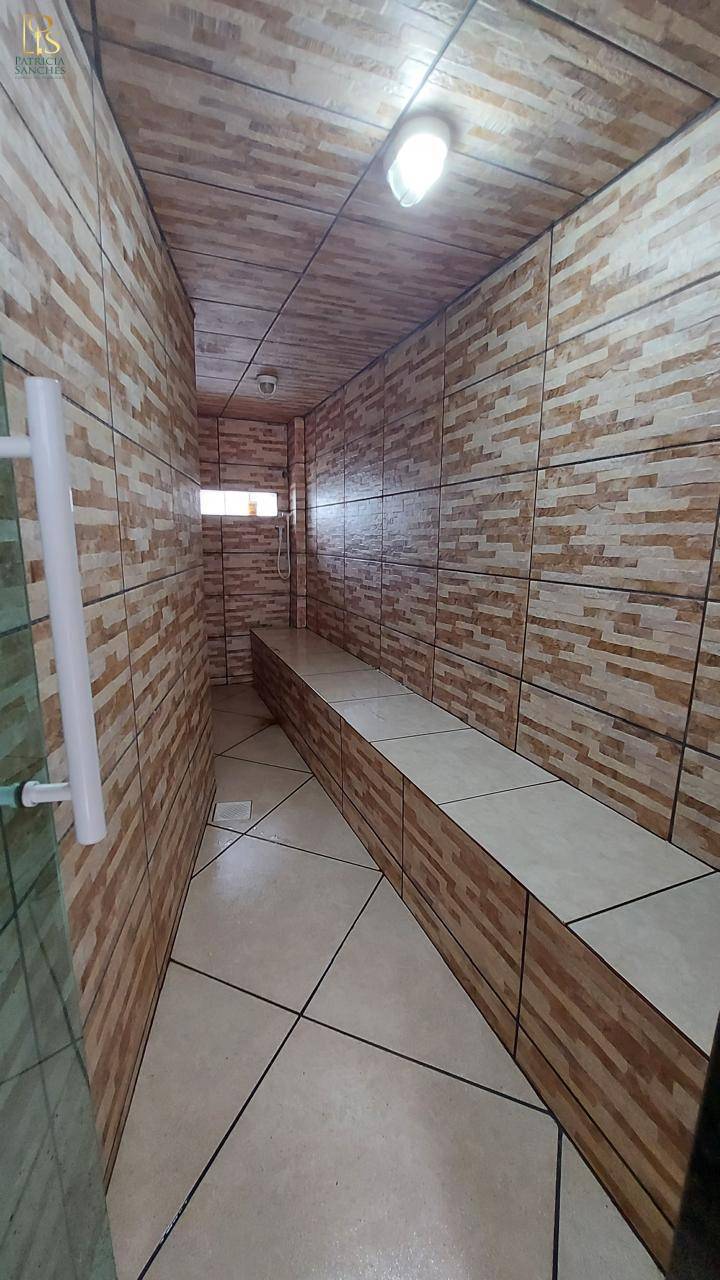 Área externa com churrasqueira, forno de pizza, fogão a lenha, piscina, ducha, sauna e banheiro.