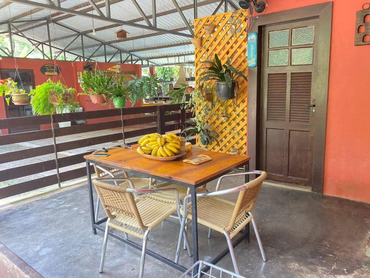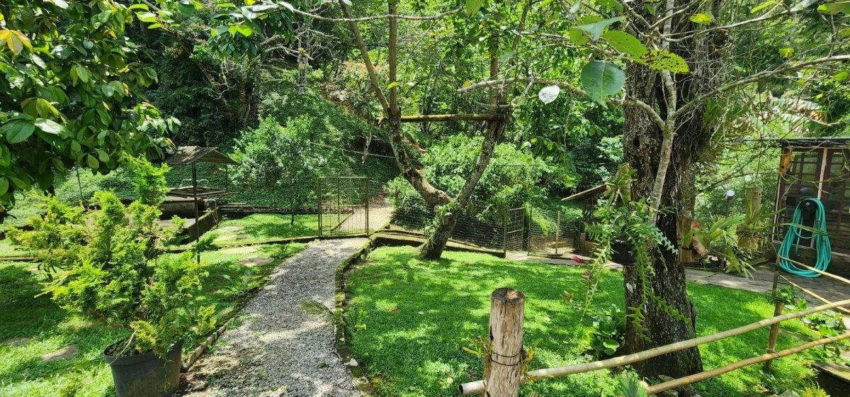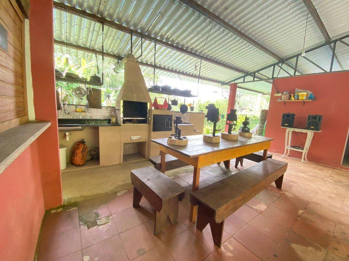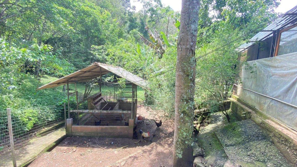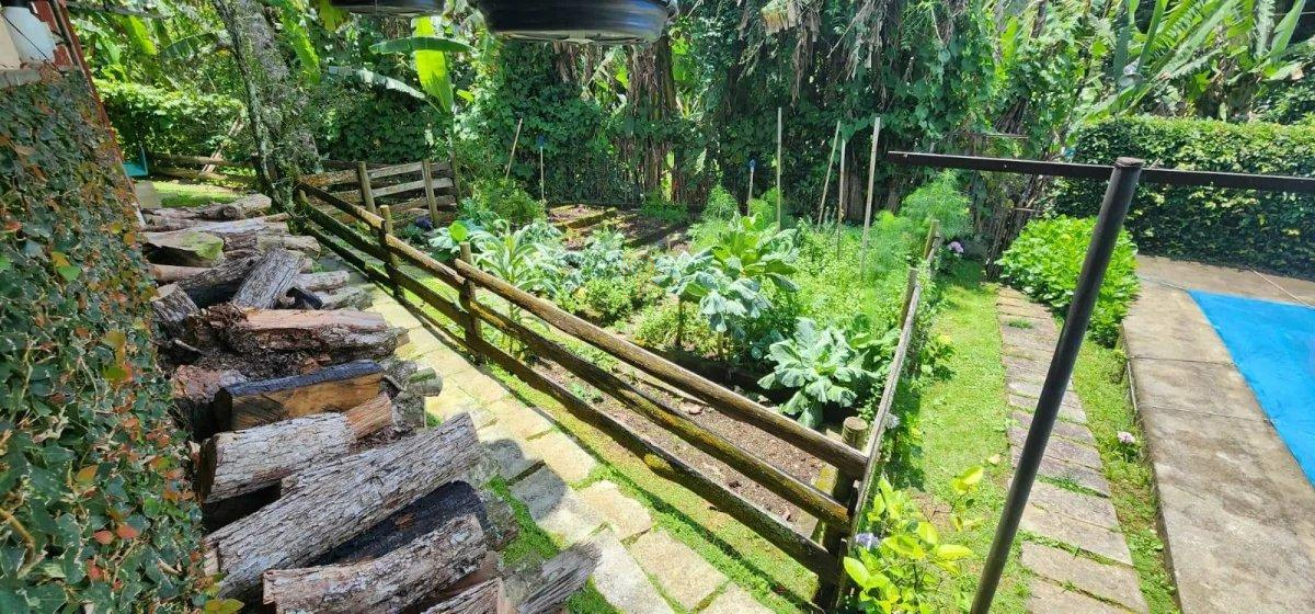 Na externa área externa encontrasse uma fonte de água de nascente, lago com tilápia, galinheiro, trilhas ecológicas, diversas arvores frutíferas, horta, plantação de milho, palmitos, jardim amplo com muitas espécies de plantas.