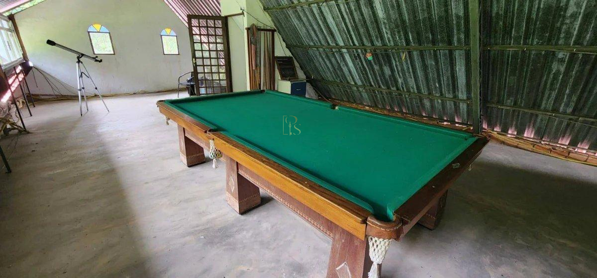 A casa principal é composta por uma varandinha com vista para área gourmet, cozinha ampla, sala em dois ambientes, 3 quartos, sendo 1 suíte, 2 varandas nas laterais da casa, uma delas envidraçada com vista para piscina e a outra aberta, tornando a casa super ventilada e fresquinha, 1 banheiro social , sótão que atualmente é utilizado como salão de jogos, lavanderia e despensa.